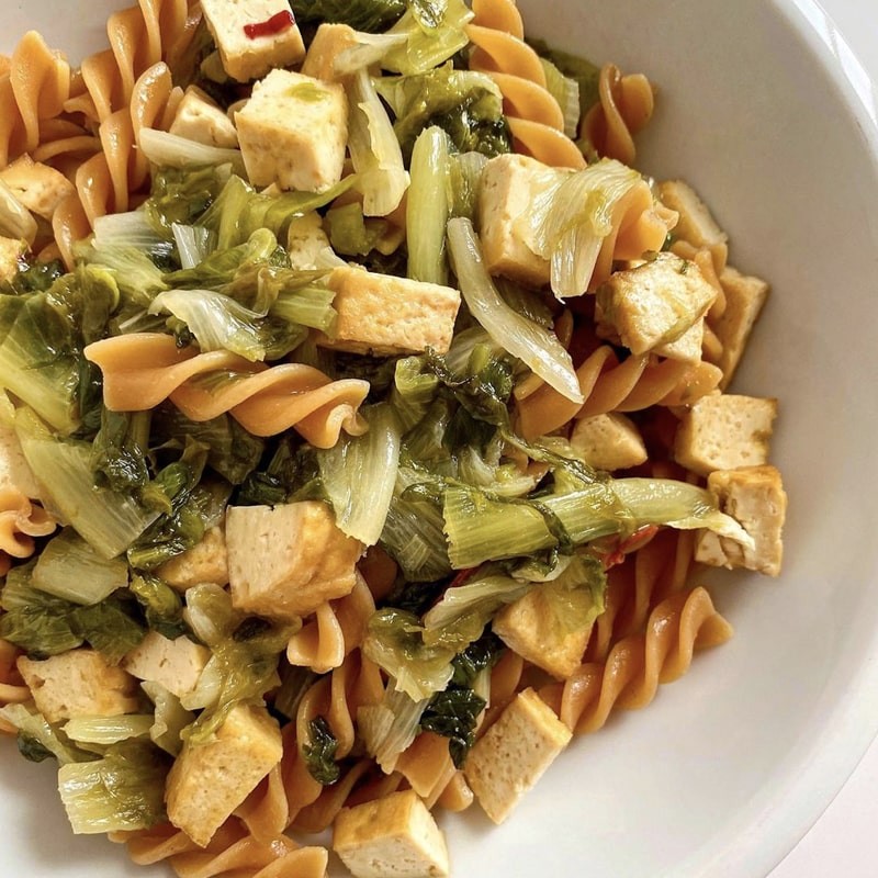 - Fusilli en ensalada con tomates cherry, espinacas frescas y semillas de lino