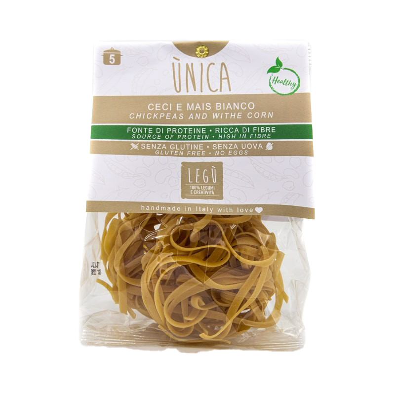 Tagliatelle mais bianco e ceci: pasta artigianale senza glutine, lavorata con materie prime cotte a vapore, trafilatura al bronzo ed essiccazione lenta. Leggera, digeribile e naturale, ricca di proteine vegetali e fibre, senza additivi né allergeni.