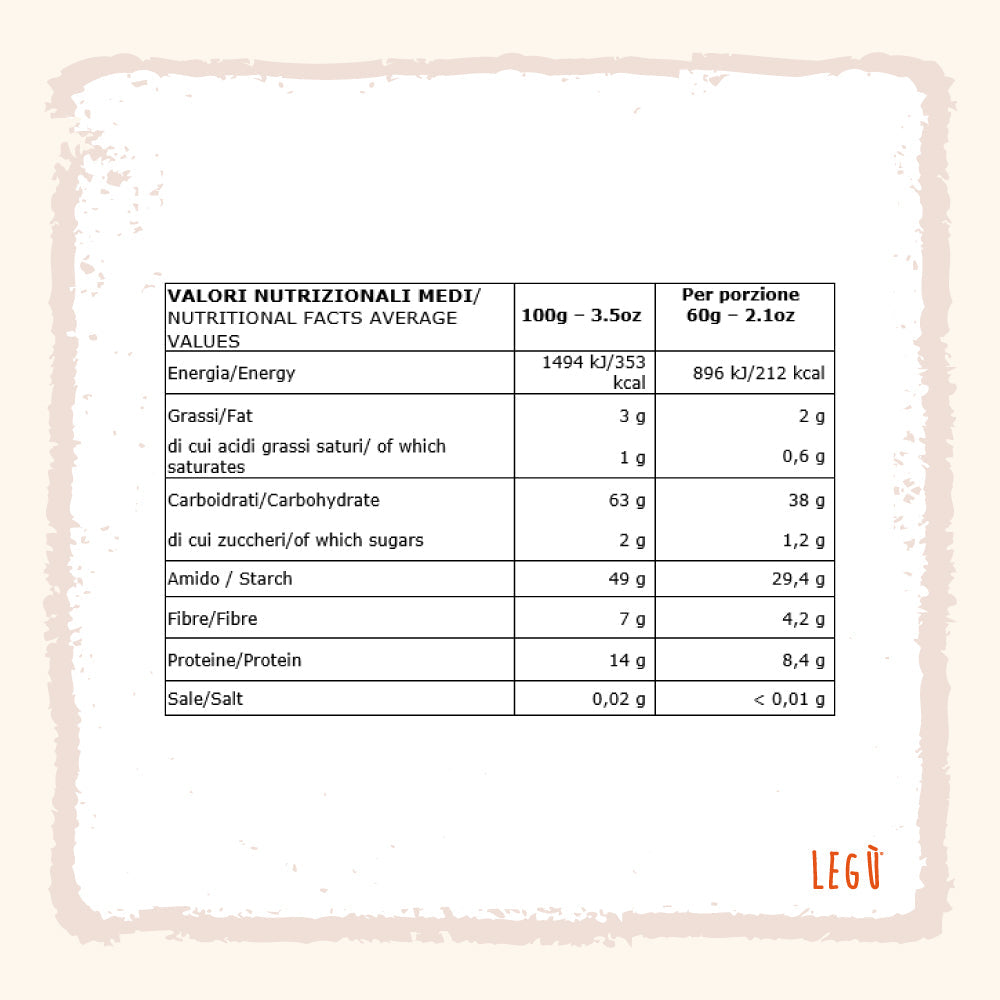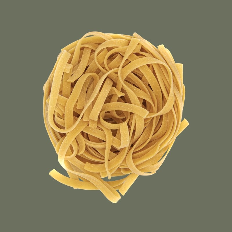Tagliatelle perfette per primi piatti gustosi e sazianti, coniugano alta resa e cottura rapida (5 minuti), 100% ingredienti vegetali italiani. Con 60 g crudi si ottengono 140 g cotti, ideali anche per diete specifiche.